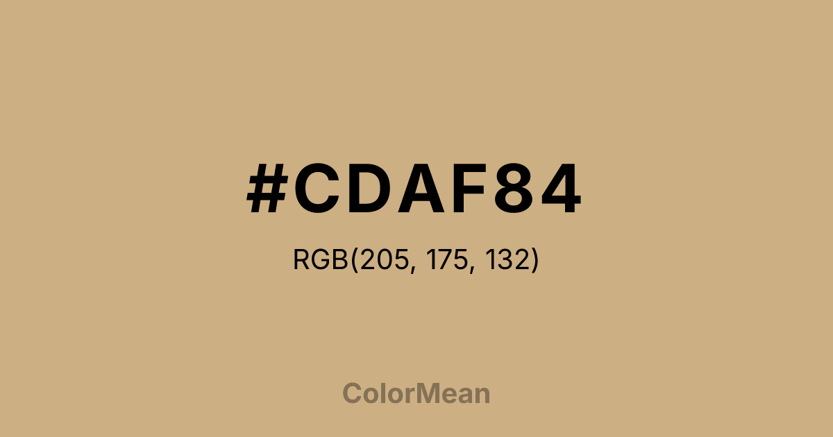 #CDAF84 RGB value is (205, 175, 132). The hex color red value is 205, green is 175, and blue is 132. Its HSL format shows a hue of 35°, saturation of 42 percent, and lightness of 66 percent. The CMYK process values are 0 percent, 15 percent, 36 percent, 20 percent.