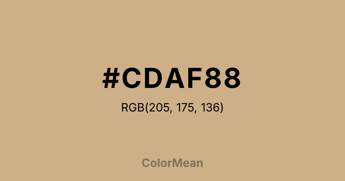 #CDAF88 RGB value is (205, 175, 136). The hex color red value is 205, green is 175, and blue is 136. Its HSL format shows a hue of 34°, saturation of 41 percent, and lightness of 67 percent. The CMYK process values are 0 percent, 15 percent, 34 percent, 20 percent.