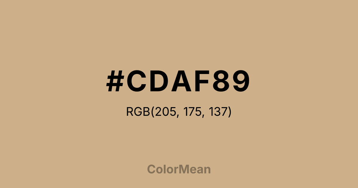 #CDAF89 RGB value is (205, 175, 137). The hex color red value is 205, green is 175, and blue is 137. Its HSL format shows a hue of 34°, saturation of 40 percent, and lightness of 67 percent. The CMYK process values are 0 percent, 15 percent, 33 percent, 20 percent.