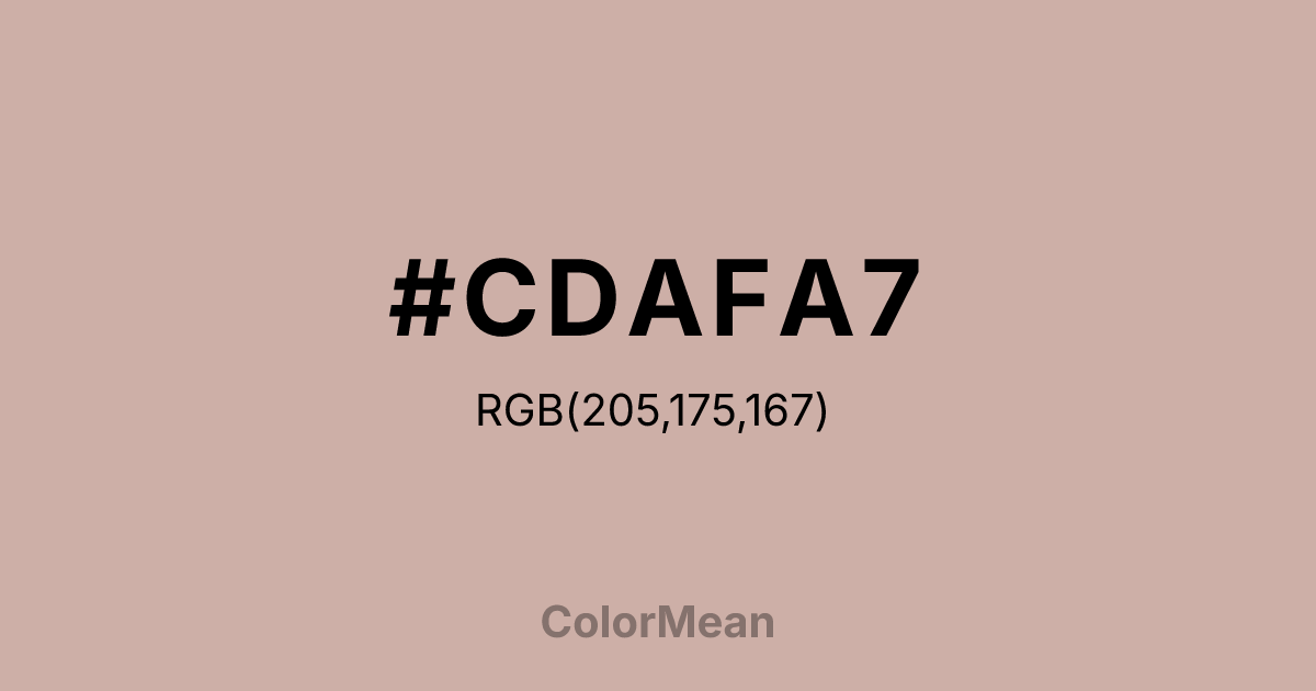#CDAFA7 RGB value is (205, 175, 167). The hex color red value is 205, green is 175, and blue is 167. Its HSL format shows a hue of 13°, saturation of 28 percent, and lightness of 73 percent. The CMYK process values are 0 percent, 15 percent, 19 percent, 20 percent.