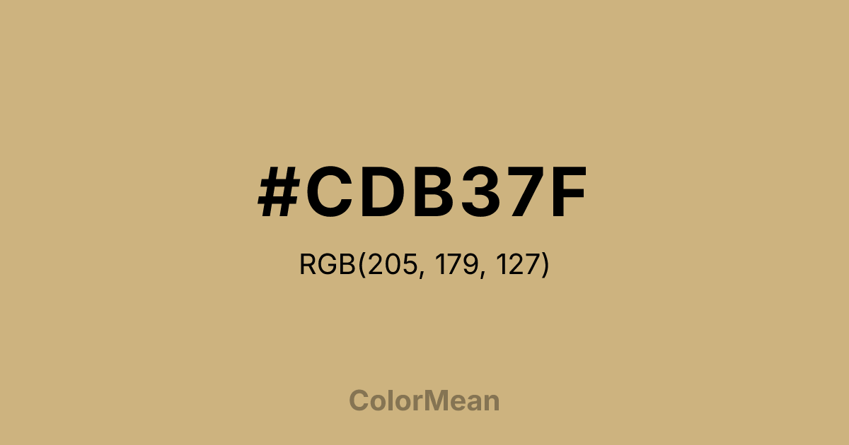 #CDB37F RGB value is (205, 179, 127). The hex color red value is 205, green is 179, and blue is 127. Its HSL format shows a hue of 40°, saturation of 44 percent, and lightness of 65 percent. The CMYK process values are 0 percent, 13 percent, 38 percent, 20 percent.