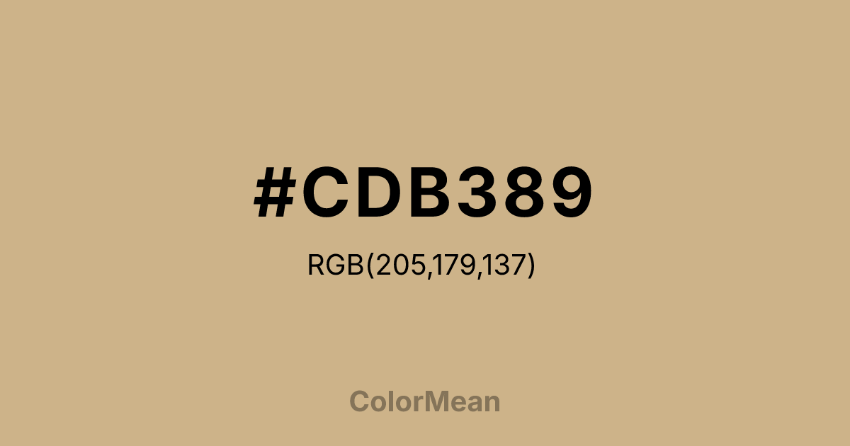 #CDB389 RGB value is (205, 179, 137). The hex color red value is 205, green is 179, and blue is 137. Its HSL format shows a hue of 37°, saturation of 40 percent, and lightness of 67 percent. The CMYK process values are 0 percent, 13 percent, 33 percent, 20 percent.