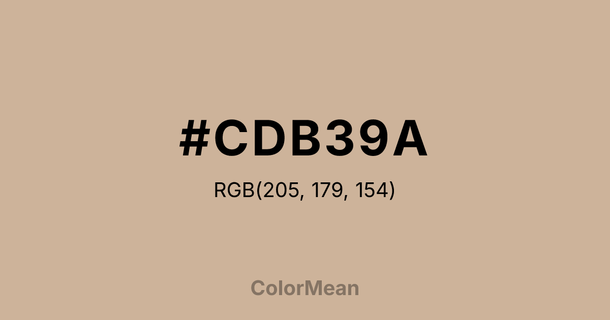 #CDB39A RGB value is (205, 179, 154). The hex color red value is 205, green is 179, and blue is 154. Its HSL format shows a hue of 29°, saturation of 34 percent, and lightness of 70 percent. The CMYK process values are 0 percent, 13 percent, 25 percent, 20 percent.