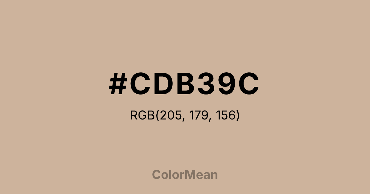 #CDB39C RGB value is (205, 179, 156). The hex color red value is 205, green is 179, and blue is 156. Its HSL format shows a hue of 28°, saturation of 33 percent, and lightness of 71 percent. The CMYK process values are 0 percent, 13 percent, 24 percent, 20 percent.
