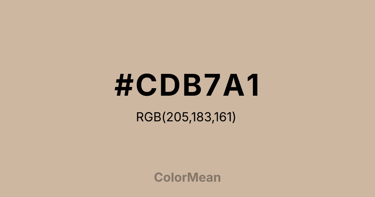 #CDB7A1 RGB value is (205, 183, 161). The hex color red value is 205, green is 183, and blue is 161. Its HSL format shows a hue of 30°, saturation of 31 percent, and lightness of 72 percent. The CMYK process values are 0 percent, 11 percent, 21 percent, 20 percent.