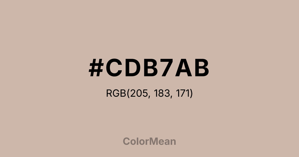#CDB7AB RGB value is (205, 183, 171). The hex color red value is 205, green is 183, and blue is 171. Its HSL format shows a hue of 21°, saturation of 25 percent, and lightness of 74 percent. The CMYK process values are 0 percent, 11 percent, 17 percent, 20 percent.