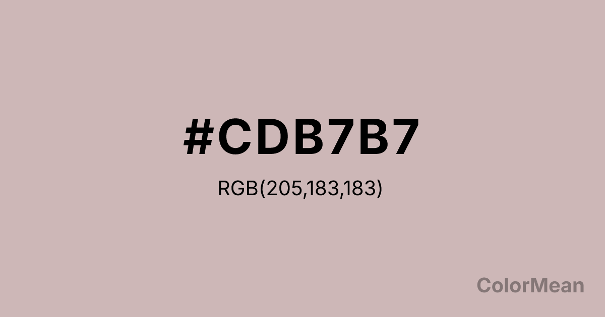 #CDB7B7 RGB value is (205, 183, 183). The hex color red value is 205, green is 183, and blue is 183. Its HSL format shows a hue of 0°, saturation of 18 percent, and lightness of 76 percent. The CMYK process values are 0 percent, 11 percent, 11 percent, 20 percent.