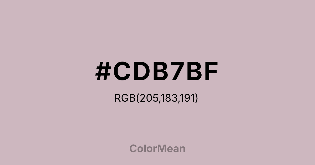 #CDB7BF RGB value is (205, 183, 191). The hex color red value is 205, green is 183, and blue is 191. Its HSL format shows a hue of 338°, saturation of 18 percent, and lightness of 76 percent. The CMYK process values are 0 percent, 11 percent, 7 percent, 20 percent.
