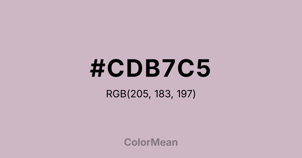 #CDB7C5 RGB value is (205, 183, 197). The hex color red value is 205, green is 183, and blue is 197. Its HSL format shows a hue of 322°, saturation of 18 percent, and lightness of 76 percent. The CMYK process values are 0 percent, 11 percent, 4 percent, 20 percent.