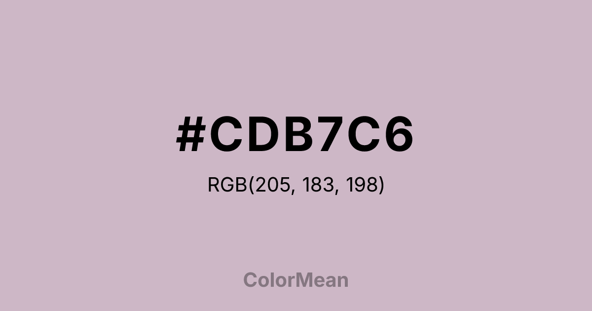 #CDB7C6 RGB value is (205, 183, 198). The hex color red value is 205, green is 183, and blue is 198. Its HSL format shows a hue of 319°, saturation of 18 percent, and lightness of 76 percent. The CMYK process values are 0 percent, 11 percent, 3 percent, 20 percent.