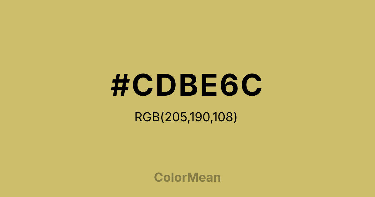 #CDBE6C RGB value is (205, 190, 108). The hex color red value is 205, green is 190, and blue is 108. Its HSL format shows a hue of 51°, saturation of 49 percent, and lightness of 61 percent. The CMYK process values are 0 percent, 7 percent, 47 percent, 20 percent.