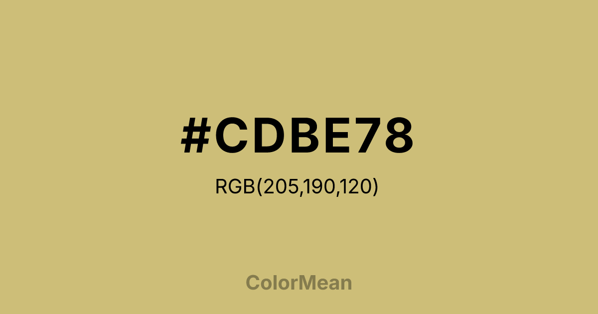 #CDBE78 RGB value is (205, 190, 120). The hex color red value is 205, green is 190, and blue is 120. Its HSL format shows a hue of 49°, saturation of 46 percent, and lightness of 64 percent. The CMYK process values are 0 percent, 7 percent, 41 percent, 20 percent.