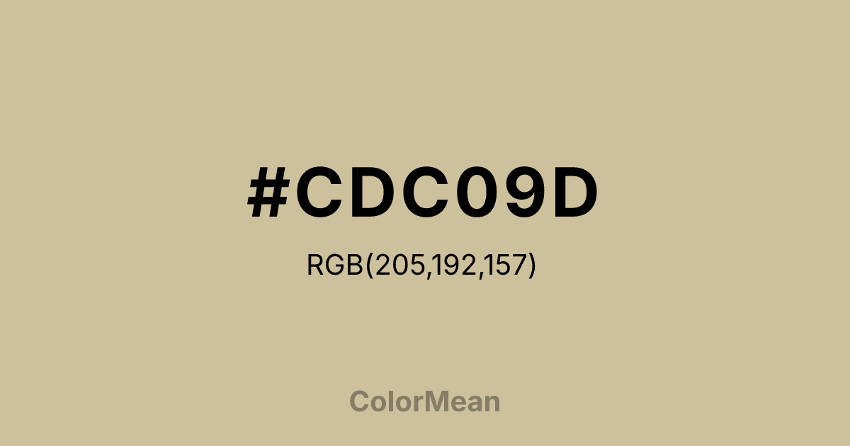 #CDC09D RGB value is (205, 192, 157). The hex color red value is 205, green is 192, and blue is 157. Its HSL format shows a hue of 44°, saturation of 32 percent, and lightness of 71 percent. The CMYK process values are 0 percent, 6 percent, 23 percent, 20 percent.