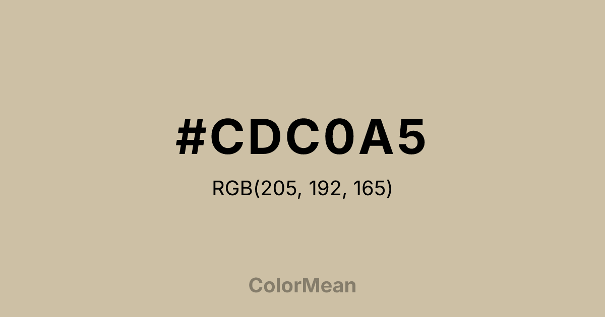 #CDC0A5 RGB value is (205, 192, 165). The hex color red value is 205, green is 192, and blue is 165. Its HSL format shows a hue of 40°, saturation of 29 percent, and lightness of 73 percent. The CMYK process values are 0 percent, 6 percent, 20 percent, 20 percent.