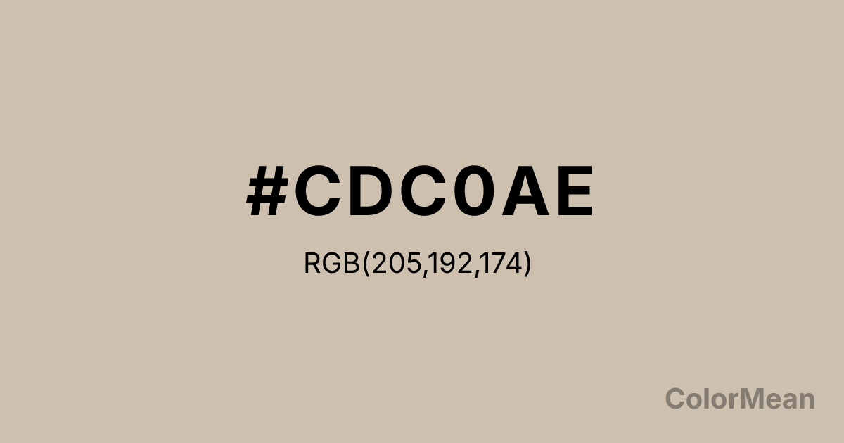 #CDC0AE RGB value is (205, 192, 174). The hex color red value is 205, green is 192, and blue is 174. Its HSL format shows a hue of 35°, saturation of 24 percent, and lightness of 74 percent. The CMYK process values are 0 percent, 6 percent, 15 percent, 20 percent.