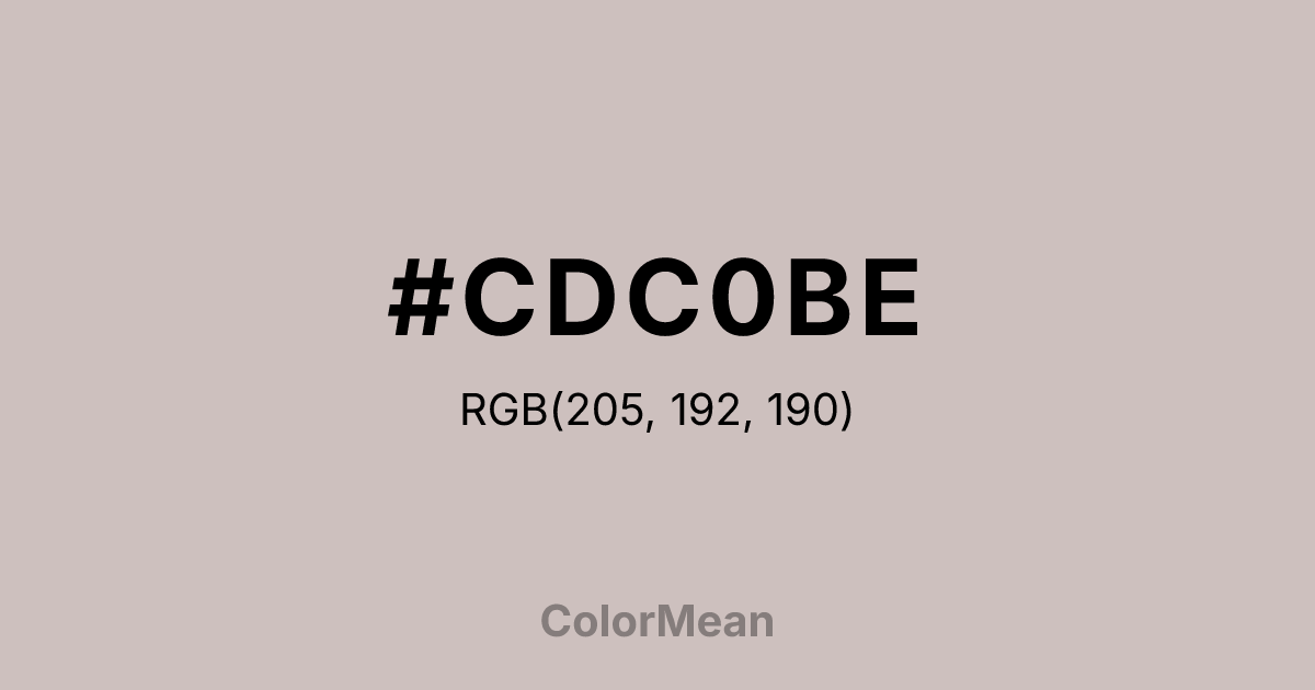 #CDC0BE RGB value is (205, 192, 190). The hex color red value is 205, green is 192, and blue is 190. Its HSL format shows a hue of 8°, saturation of 13 percent, and lightness of 77 percent. The CMYK process values are 0 percent, 6 percent, 7 percent, 20 percent.