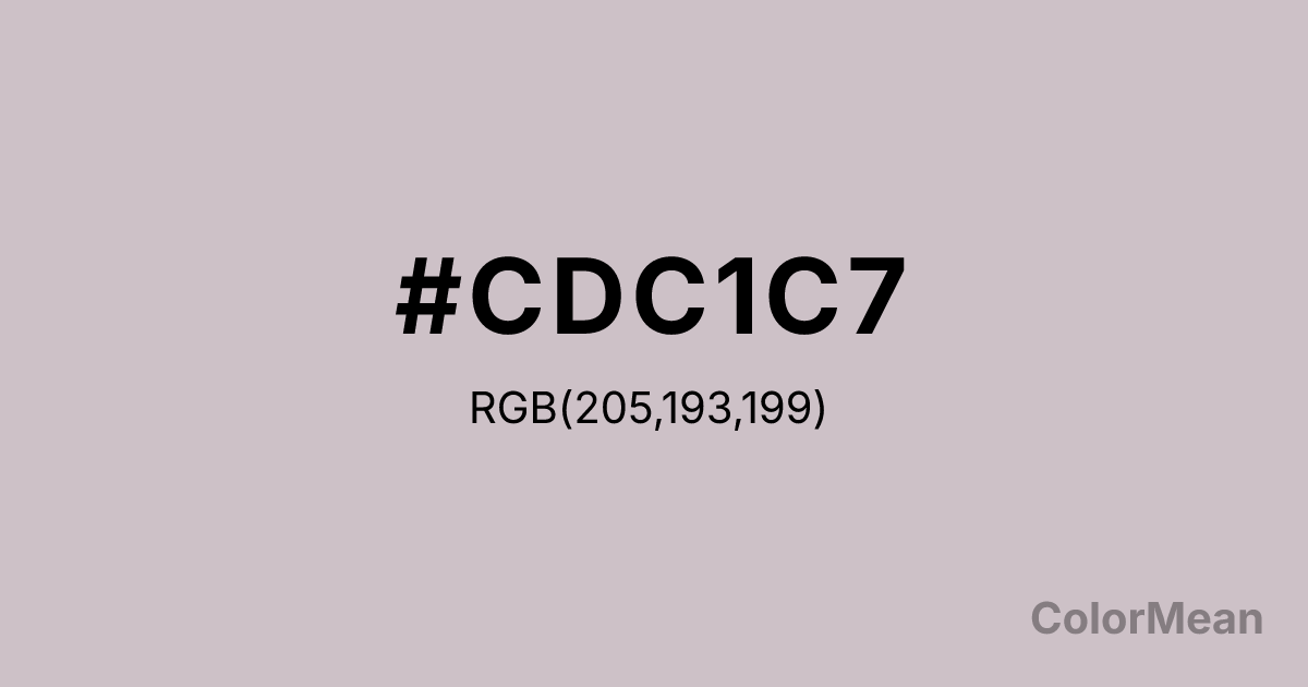 #CDC1C7 RGB value is (205, 193, 199). The hex color red value is 205, green is 193, and blue is 199. Its HSL format shows a hue of 330°, saturation of 11 percent, and lightness of 78 percent. The CMYK process values are 0 percent, 6 percent, 3 percent, 20 percent.
