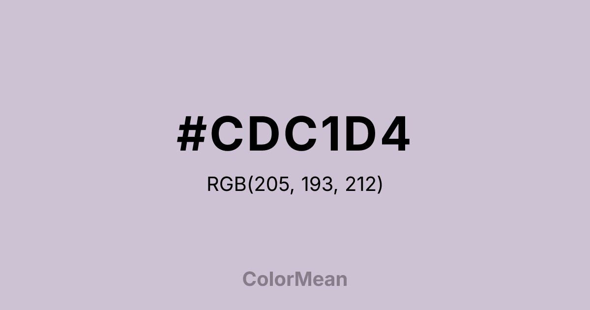 #CDC1D4 RGB value is (205, 193, 212). The hex color red value is 205, green is 193, and blue is 212. Its HSL format shows a hue of 278°, saturation of 18 percent, and lightness of 79 percent. The CMYK process values are 3 percent, 9 percent, 0 percent, 17 percent.