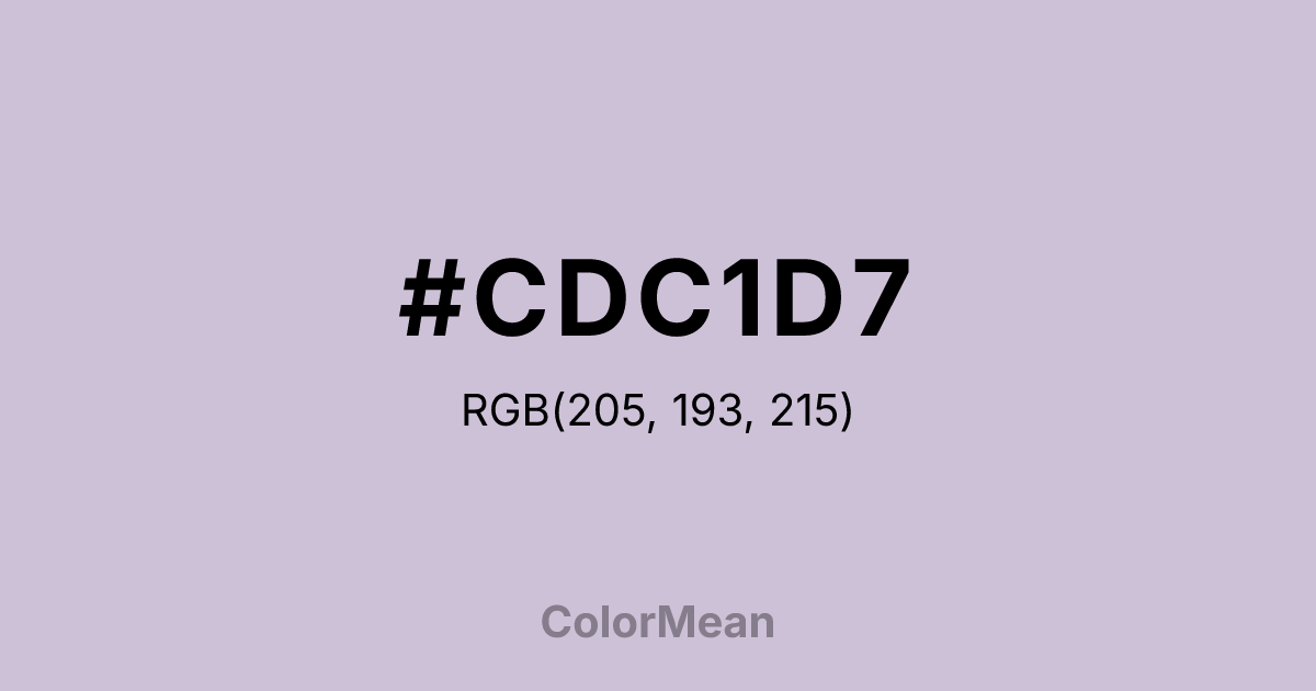 #CDC1D7 RGB value is (205, 193, 215). The hex color red value is 205, green is 193, and blue is 215. Its HSL format shows a hue of 273°, saturation of 22 percent, and lightness of 80 percent. The CMYK process values are 5 percent, 10 percent, 0 percent, 16 percent.