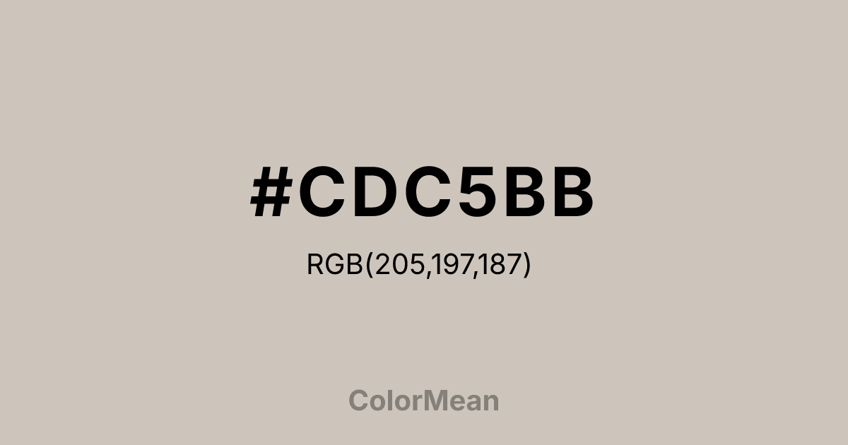 #CDC5BB RGB value is (205, 197, 187). The hex color red value is 205, green is 197, and blue is 187. Its HSL format shows a hue of 33°, saturation of 15 percent, and lightness of 77 percent. The CMYK process values are 0 percent, 4 percent, 9 percent, 20 percent.