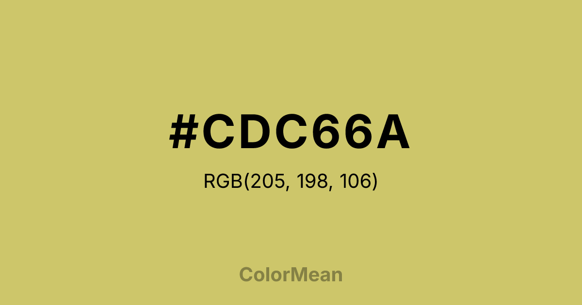 #CDC66A RGB value is (205, 198, 106). The hex color red value is 205, green is 198, and blue is 106. Its HSL format shows a hue of 56°, saturation of 50 percent, and lightness of 61 percent. The CMYK process values are 0 percent, 3 percent, 48 percent, 20 percent.