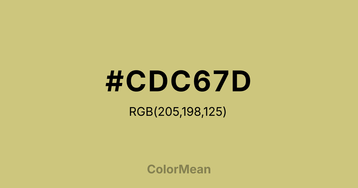 #CDC67D RGB value is (205, 198, 125). The hex color red value is 205, green is 198, and blue is 125. Its HSL format shows a hue of 55°, saturation of 44 percent, and lightness of 65 percent. The CMYK process values are 0 percent, 3 percent, 39 percent, 20 percent.