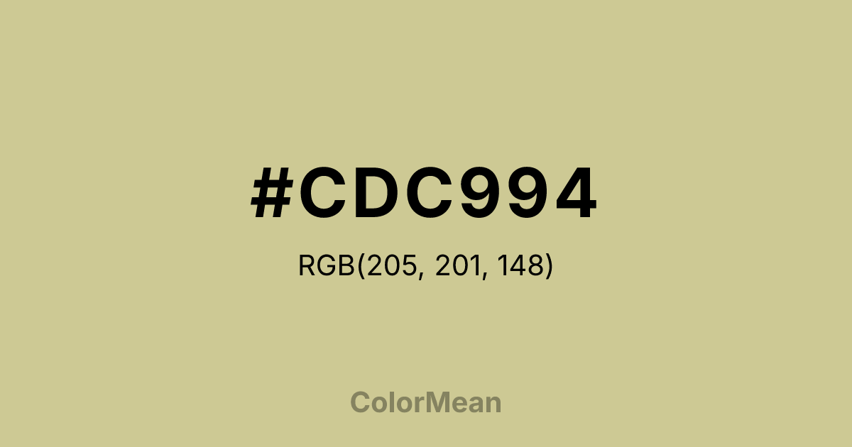 #CDC994 RGB value is (205, 201, 148). The hex color red value is 205, green is 201, and blue is 148. Its HSL format shows a hue of 56°, saturation of 36 percent, and lightness of 69 percent. The CMYK process values are 0 percent, 2 percent, 28 percent, 20 percent.