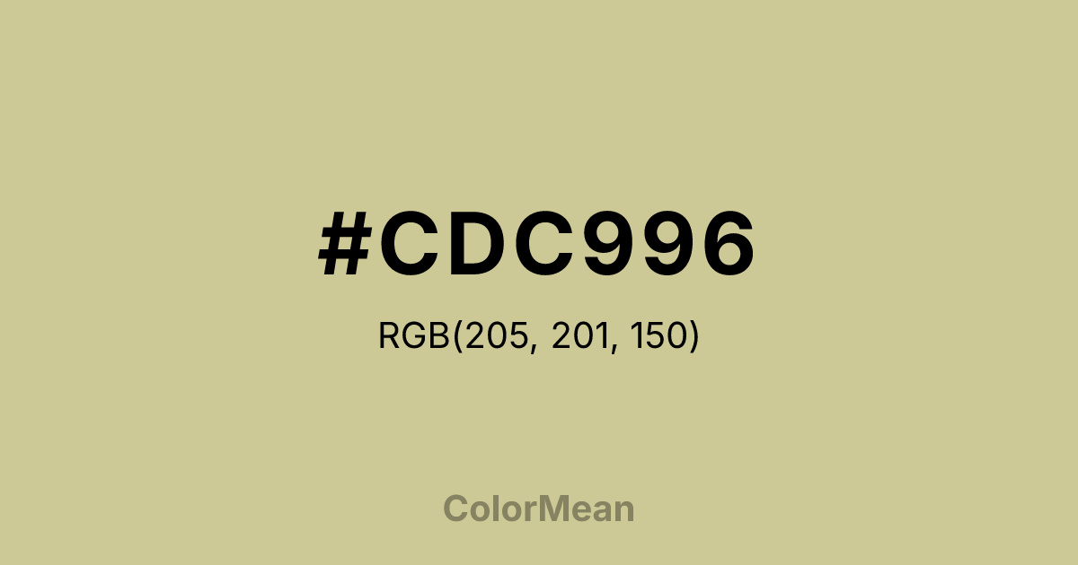 #CDC996 RGB value is (205, 201, 150). The hex color red value is 205, green is 201, and blue is 150. Its HSL format shows a hue of 56°, saturation of 35 percent, and lightness of 70 percent. The CMYK process values are 0 percent, 2 percent, 27 percent, 20 percent.