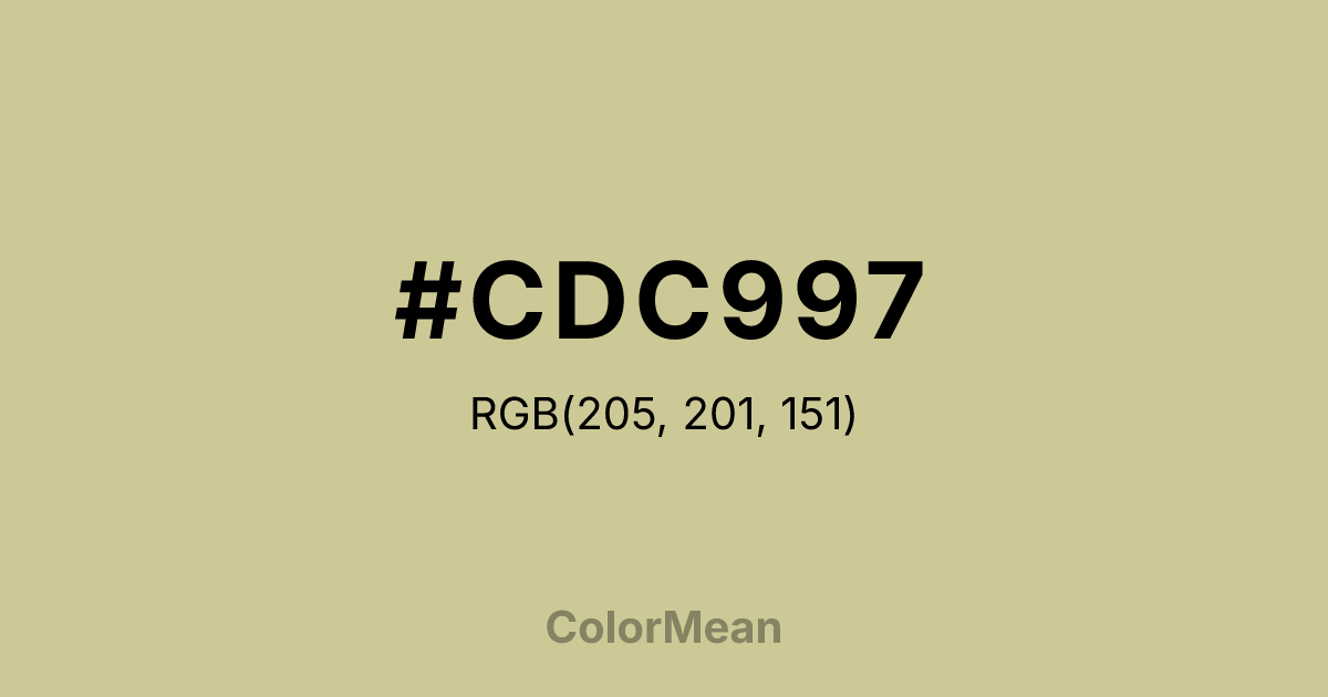 #CDC997 RGB value is (205, 201, 151). The hex color red value is 205, green is 201, and blue is 151. Its HSL format shows a hue of 56°, saturation of 35 percent, and lightness of 70 percent. The CMYK process values are 0 percent, 2 percent, 26 percent, 20 percent.