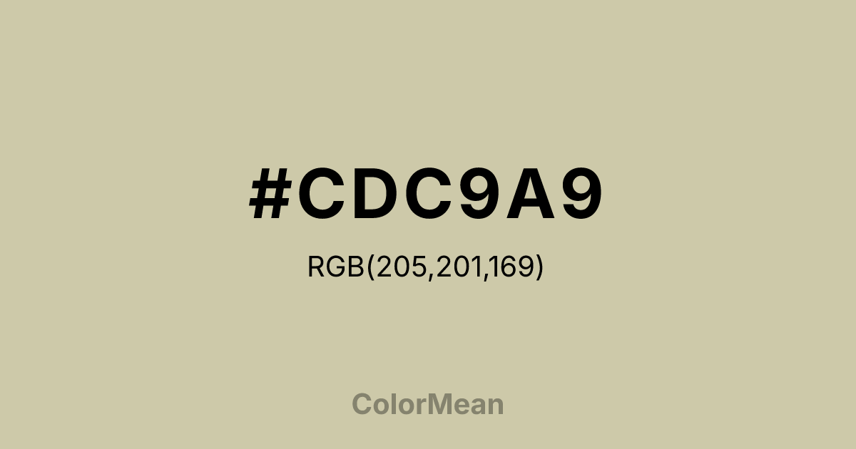 #CDC9A9 RGB value is (205, 201, 169). The hex color red value is 205, green is 201, and blue is 169. Its HSL format shows a hue of 53°, saturation of 26 percent, and lightness of 73 percent. The CMYK process values are 0 percent, 2 percent, 18 percent, 20 percent.