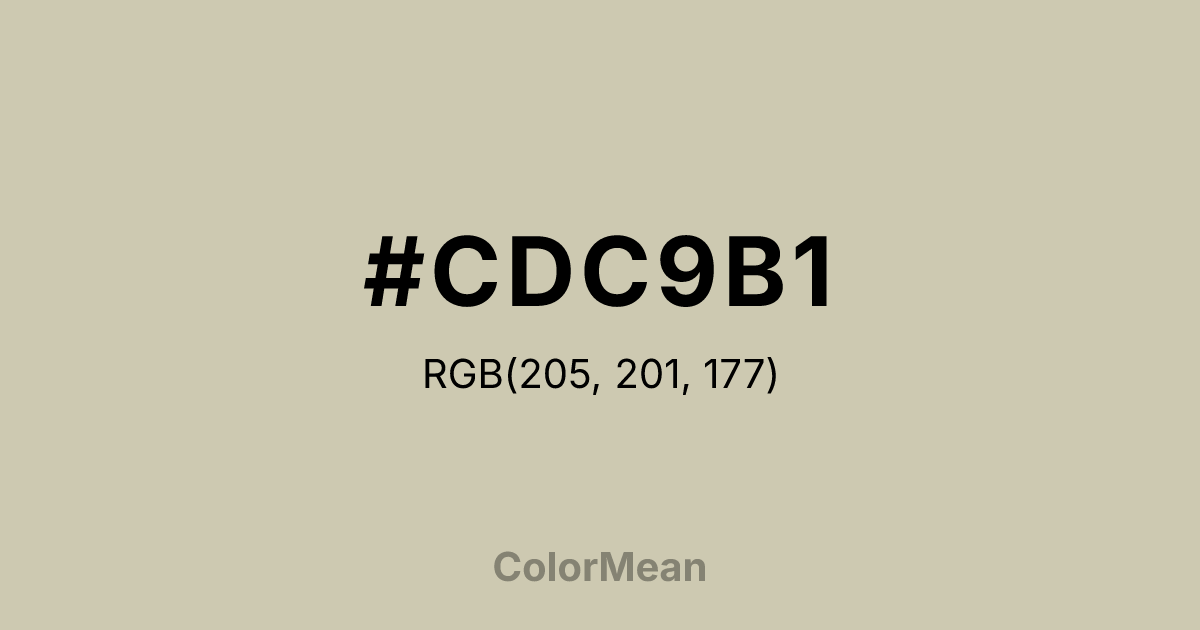 #CDC9B1 RGB value is (205, 201, 177). The hex color red value is 205, green is 201, and blue is 177. Its HSL format shows a hue of 51°, saturation of 22 percent, and lightness of 75 percent. The CMYK process values are 0 percent, 2 percent, 14 percent, 20 percent.