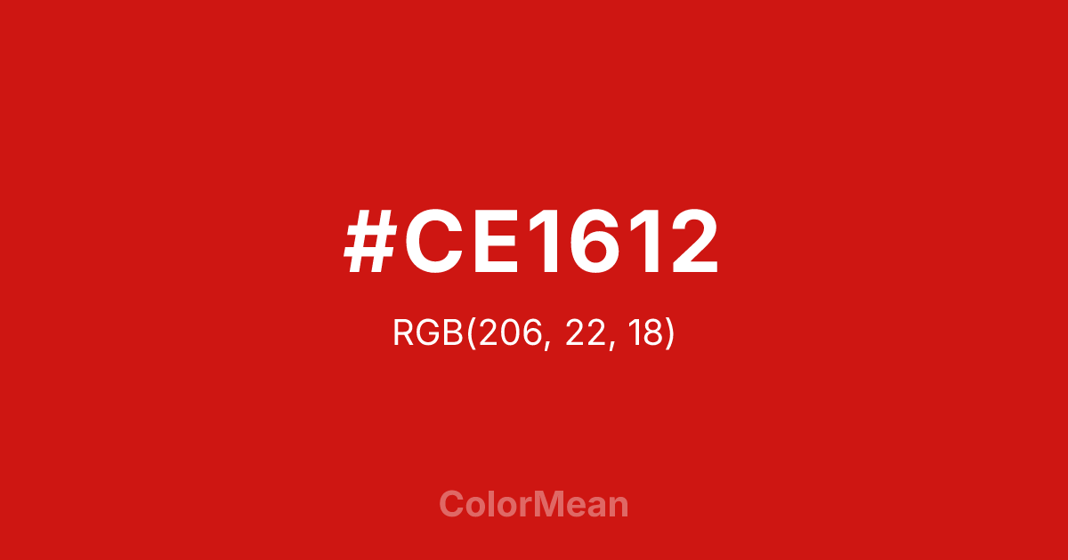#CE1612 RGB value is (206, 22, 18). The hex color red value is 206, green is 22, and blue is 18. Its HSL format shows a hue of 1°, saturation of 84 percent, and lightness of 44 percent. The CMYK process values are 0 percent, 89 percent, 91 percent, 19 percent.