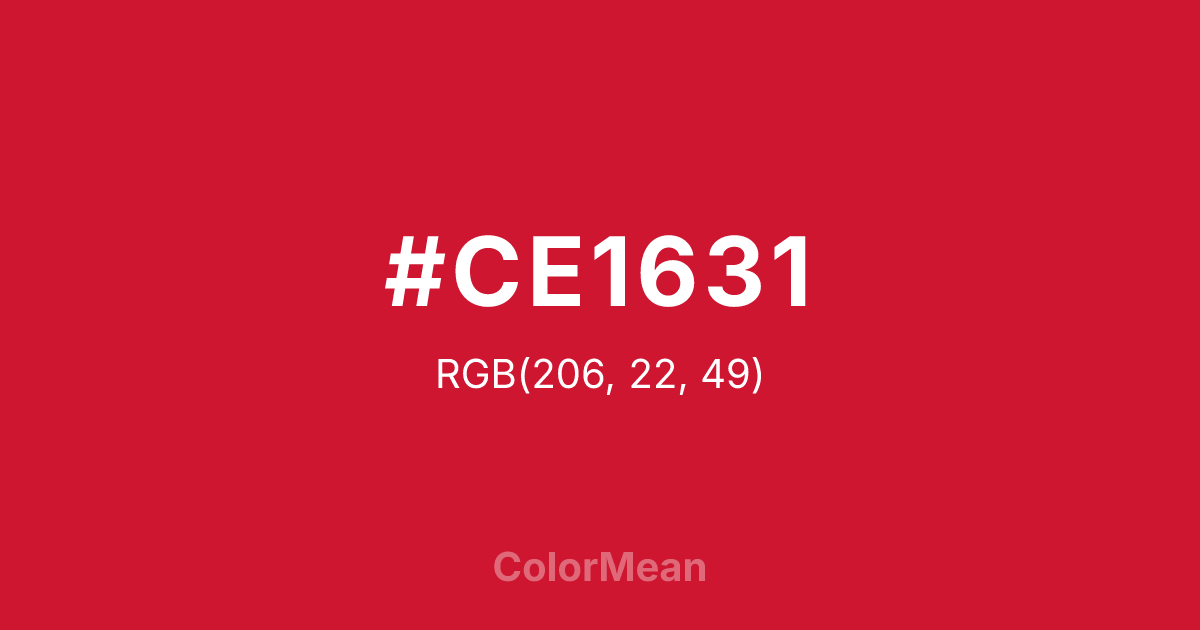 #CE1631 RGB value is (206, 22, 49). The hex color red value is 206, green is 22, and blue is 49. Its HSL format shows a hue of 351°, saturation of 81 percent, and lightness of 45 percent. The CMYK process values are 0 percent, 89 percent, 76 percent, 19 percent.