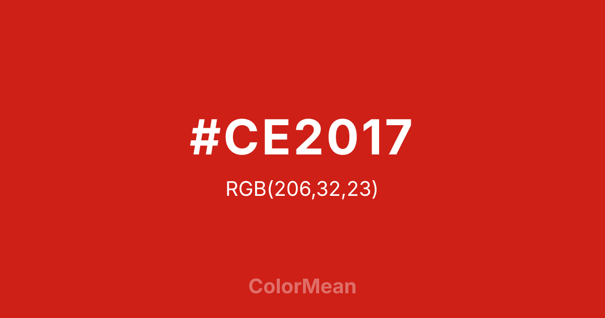 #CE2017 RGB value is (206, 32, 23). The hex color red value is 206, green is 32, and blue is 23. Its HSL format shows a hue of 3°, saturation of 80 percent, and lightness of 45 percent. The CMYK process values are 0 percent, 84 percent, 89 percent, 19 percent.