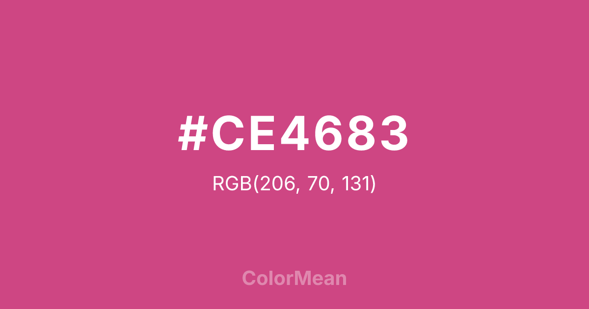 #CE4683 RGB value is (206, 70, 131). The hex color red value is 206, green is 70, and blue is 131. Its HSL format shows a hue of 333°, saturation of 58 percent, and lightness of 54 percent. The CMYK process values are 0 percent, 66 percent, 36 percent, 19 percent.