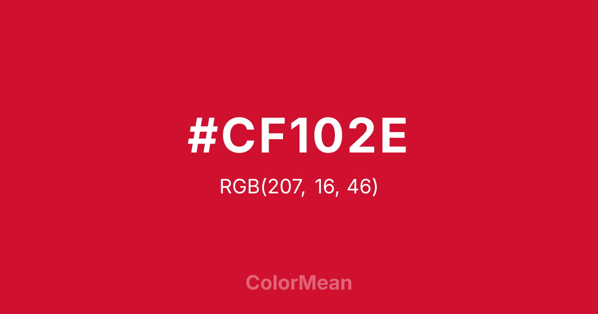 #CF102E RGB value is (207, 16, 46). The hex color red value is 207, green is 16, and blue is 46. Its HSL format shows a hue of 351°, saturation of 86 percent, and lightness of 44 percent. The CMYK process values are 0 percent, 92 percent, 78 percent, 19 percent.
