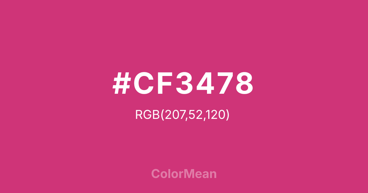 #CF3478 RGB value is (207, 52, 120). The hex color red value is 207, green is 52, and blue is 120. Its HSL format shows a hue of 334°, saturation of 62 percent, and lightness of 51 percent. The CMYK process values are 0 percent, 75 percent, 42 percent, 19 percent.