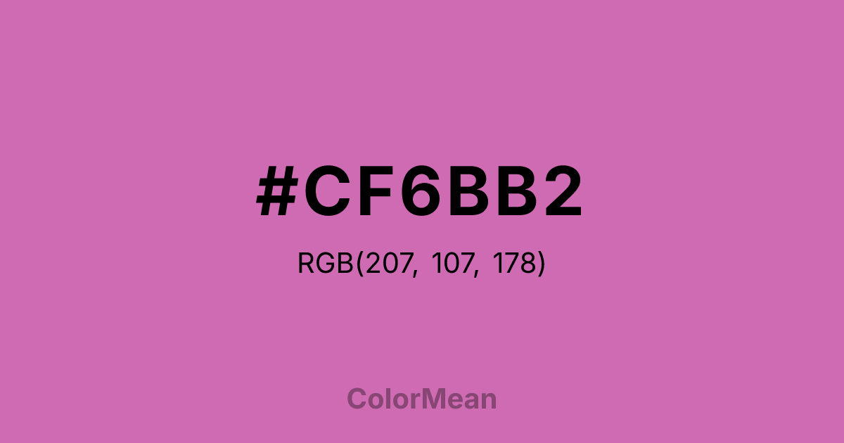 #CF6BB2 RGB value is (207, 107, 178). The hex color red value is 207, green is 107, and blue is 178. Its HSL format shows a hue of 317°, saturation of 51 percent, and lightness of 62 percent. The CMYK process values are 0 percent, 48 percent, 14 percent, 19 percent.