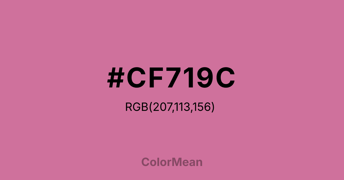 #CF719C RGB value is (207, 113, 156). The hex color red value is 207, green is 113, and blue is 156. Its HSL format shows a hue of 333°, saturation of 49 percent, and lightness of 63 percent. The CMYK process values are 0 percent, 45 percent, 25 percent, 19 percent.