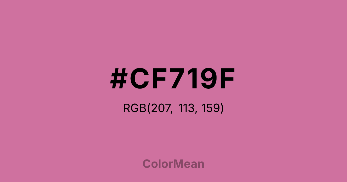 #CF719F RGB value is (207, 113, 159). The hex color red value is 207, green is 113, and blue is 159. Its HSL format shows a hue of 331°, saturation of 49 percent, and lightness of 63 percent. The CMYK process values are 0 percent, 45 percent, 23 percent, 19 percent.