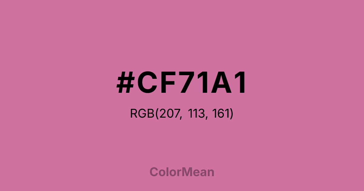 #CF71A1 RGB value is (207, 113, 161). The hex color red value is 207, green is 113, and blue is 161. Its HSL format shows a hue of 329°, saturation of 49 percent, and lightness of 63 percent. The CMYK process values are 0 percent, 45 percent, 22 percent, 19 percent.