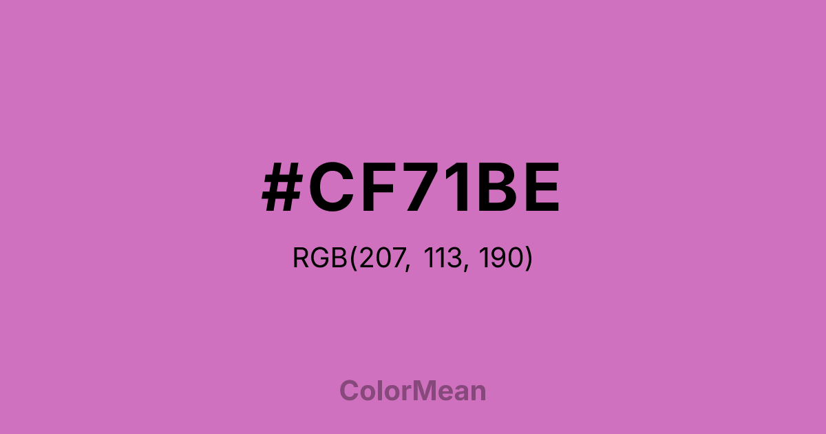 #CF71BE RGB value is (207, 113, 190). The hex color red value is 207, green is 113, and blue is 190. Its HSL format shows a hue of 311°, saturation of 49 percent, and lightness of 63 percent. The CMYK process values are 0 percent, 45 percent, 8 percent, 19 percent.