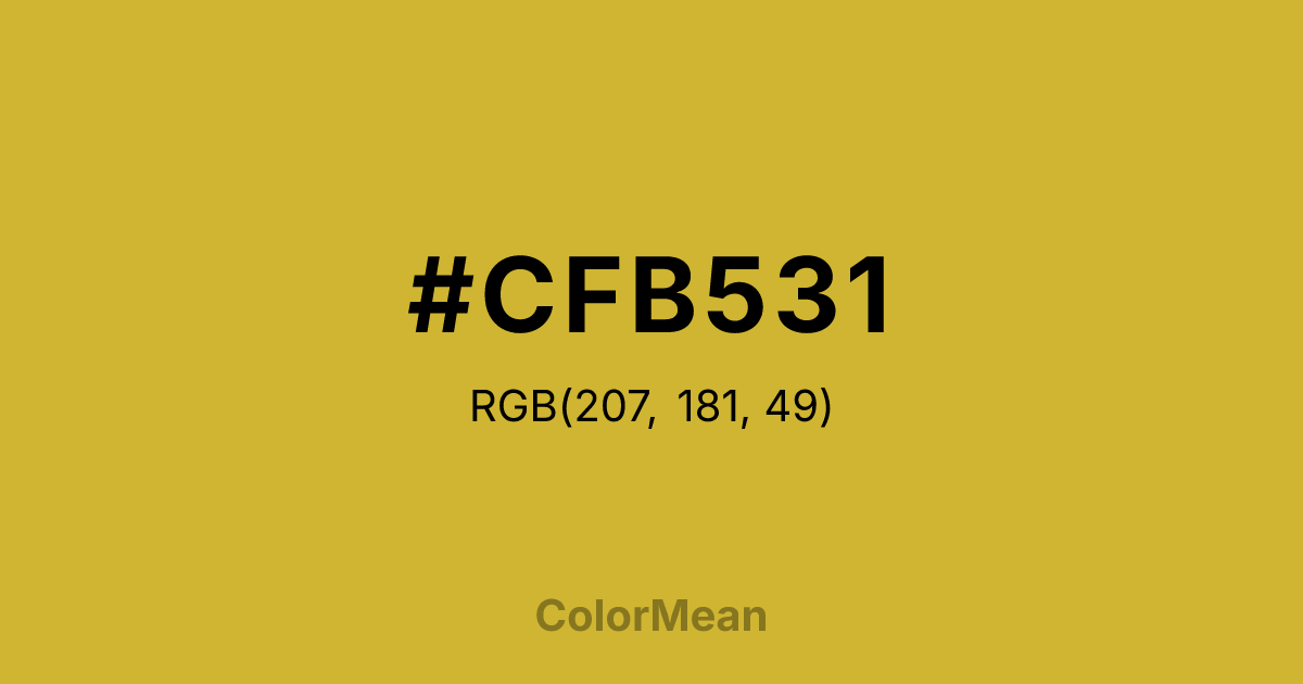 #CFB531 RGB value is (207, 181, 49). The hex color red value is 207, green is 181, and blue is 49. Its HSL format shows a hue of 50°, saturation of 62 percent, and lightness of 50 percent. The CMYK process values are 0 percent, 13 percent, 76 percent, 19 percent.
