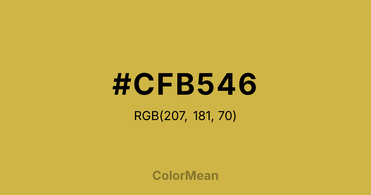 #CFB546 RGB value is (207, 181, 70). The hex color red value is 207, green is 181, and blue is 70. Its HSL format shows a hue of 49°, saturation of 59 percent, and lightness of 54 percent. The CMYK process values are 0 percent, 13 percent, 66 percent, 19 percent.