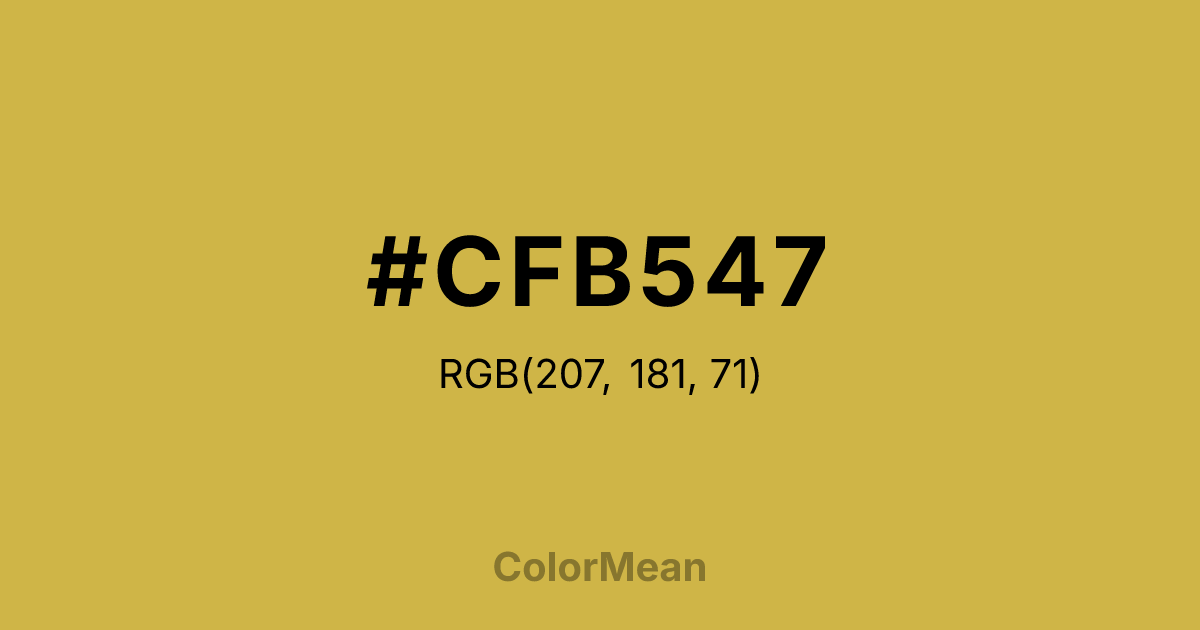 #CFB547 RGB value is (207, 181, 71). The hex color red value is 207, green is 181, and blue is 71. Its HSL format shows a hue of 49°, saturation of 59 percent, and lightness of 55 percent. The CMYK process values are 0 percent, 13 percent, 66 percent, 19 percent.