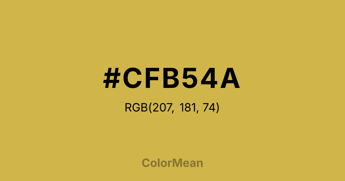#CFB54A RGB value is (207, 181, 74). The hex color red value is 207, green is 181, and blue is 74. Its HSL format shows a hue of 48°, saturation of 58 percent, and lightness of 55 percent. The CMYK process values are 0 percent, 13 percent, 64 percent, 19 percent.