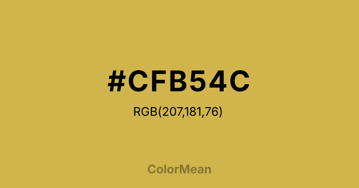 #CFB54C RGB value is (207, 181, 76). The hex color red value is 207, green is 181, and blue is 76. Its HSL format shows a hue of 48°, saturation of 58 percent, and lightness of 55 percent. The CMYK process values are 0 percent, 13 percent, 63 percent, 19 percent.
