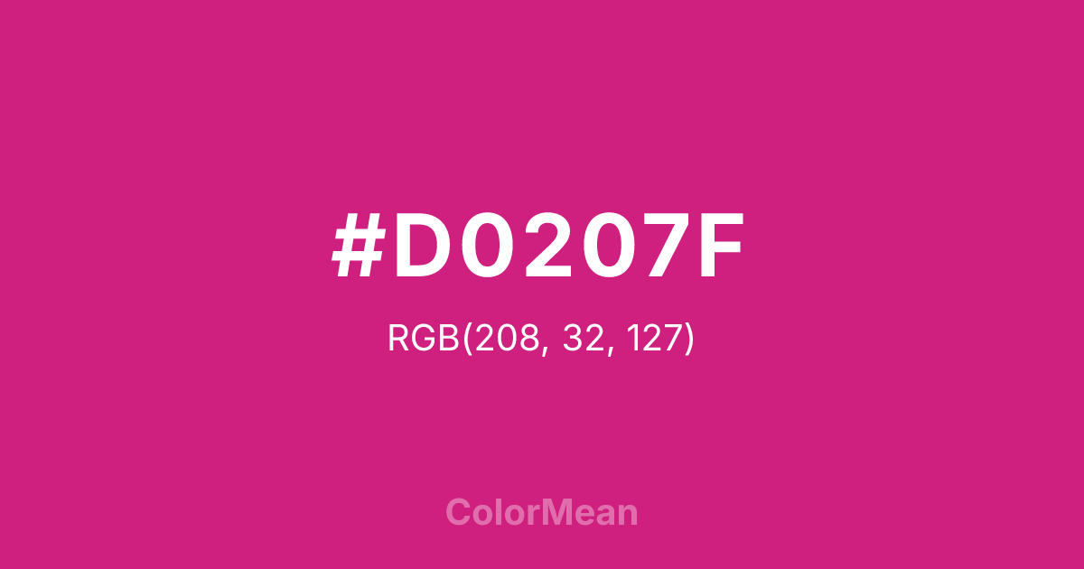 #D0207F RGB value is (208, 32, 127). The hex color red value is 208, green is 32, and blue is 127. Its HSL format shows a hue of 328°, saturation of 73 percent, and lightness of 47 percent. The CMYK process values are 0 percent, 85 percent, 39 percent, 18 percent.