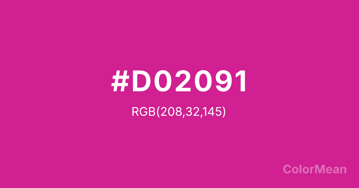 #D02091 RGB value is (208, 32, 145). The hex color red value is 208, green is 32, and blue is 145. Its HSL format shows a hue of 321°, saturation of 73 percent, and lightness of 47 percent. The CMYK process values are 0 percent, 85 percent, 30 percent, 18 percent.