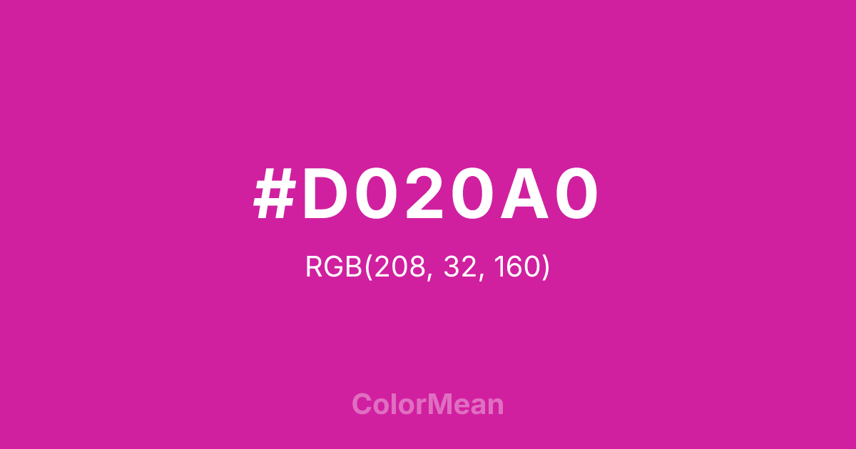 #D020A0 RGB value is (208, 32, 160). The hex color red value is 208, green is 32, and blue is 160. Its HSL format shows a hue of 316°, saturation of 73 percent, and lightness of 47 percent. The CMYK process values are 0 percent, 85 percent, 23 percent, 18 percent.